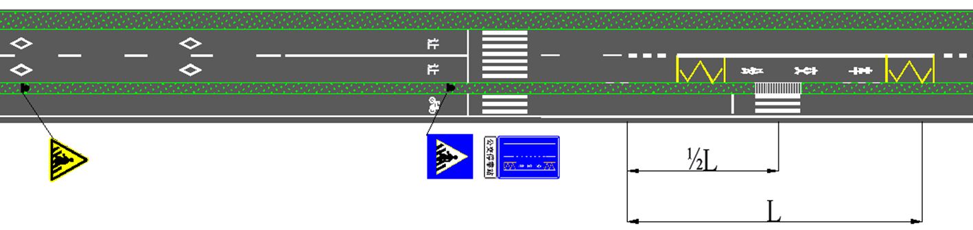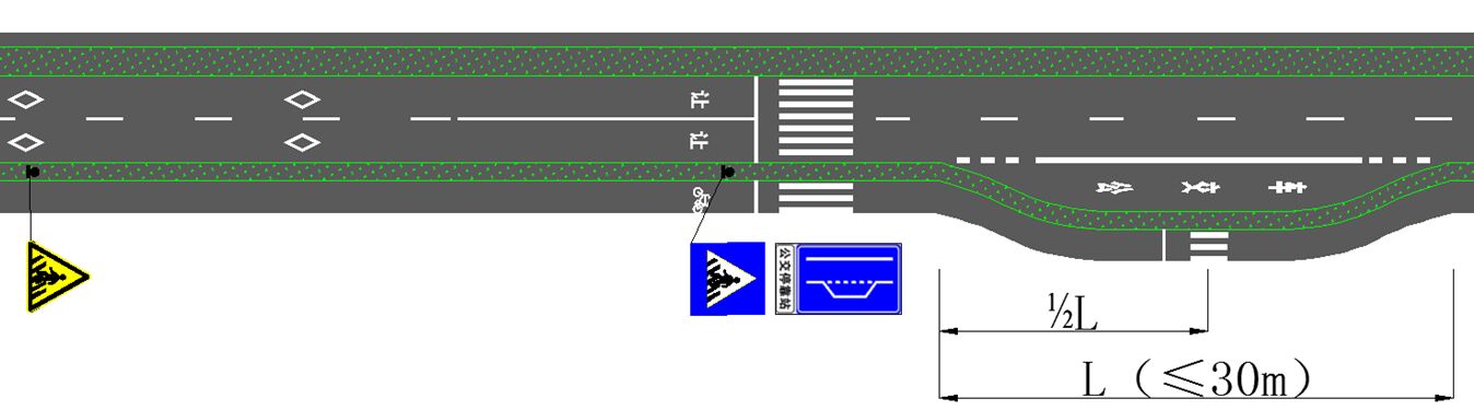 其中,站臺長度≤30米的,站臺1/2處設置一道3米寬度人行橫道線,詳見下圖;