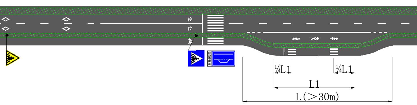 其中,站臺長度>30米的,頭尾1/4處分別設置3米寬度人行橫道線,詳見下圖;