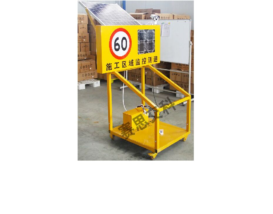 1、標志整體為立體裝置平臺,主要包括:語音警示喇叭、速度條碼顯示屏、視頻記錄攝像頭、太陽能蓄電池供電系統等設備。當被測車輛通行車速超過限制速度時,速度條碼顯示屏以紅色顯示當前車速,并啟動語音警示喇叭告知車輛以超速行駛;當被測車輛通行車速超過限制速度時,速度條碼顯示屏以綠色顯示當前車速。攝像頭全天候記錄路段動態視頻,夜間開啟補光燈。該裝置對車輛超速行駛行為有較高的警示效果、特別適用于事故易發路段、團霧頻發路段、需加強管理路段。