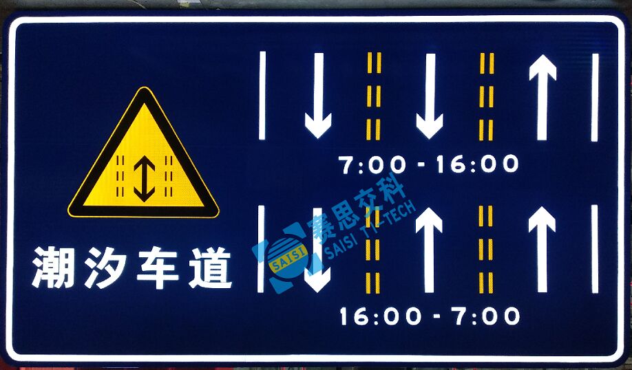 標志版面的圖形、文字、符號等關鍵信息采用全自動鏤空雕刻工藝,內置均光光源板,定向投射穿透專用透光膜及鏤空面,在標志面板形成視覺柔和的面光源發光標志版面,實現主動發光功能,提高在夜晚或惡劣交通環境中的全天候視認效果,提升潮汐車道信息的遠距離視認和動態易觀察性。標志參考圖如下: