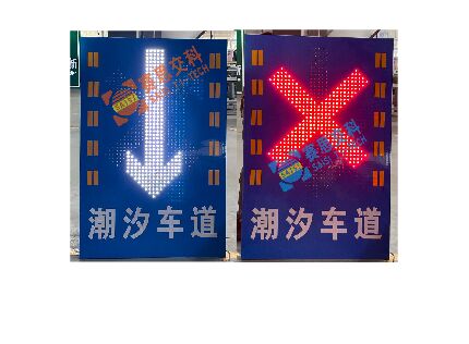 本款潮汐車道發光標志牌,采用半透式主動發光工藝,標志整體采用指示類標志版面,依據國標《道路交通標志和標線》(GB5768-2009)中所列的《潮汐車道標志》警告類版面,并對中間車道在不同時間段內的通行權進行分配,實現潮汐車道交通秩序的管控。地面應當配合國標,施劃潮汐車道地面標識。