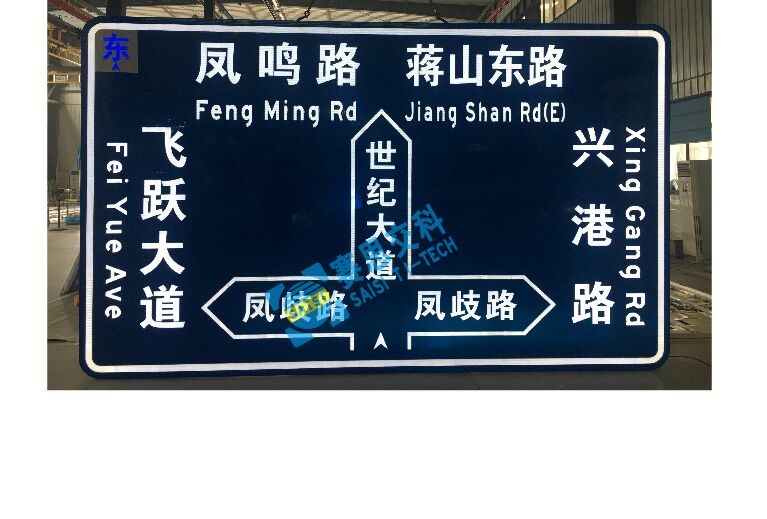 4、指路標(biāo)志 。在道路中,根據(jù)不同道路級別,設(shè)置于交叉口進(jìn)口方向,通常據(jù)進(jìn)口車道停止線80—120米范圍內(nèi)。