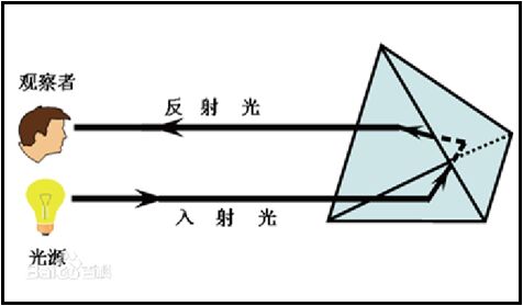 交通標志牌的反光功能,是通過反光膜的逆反射性能來實現(xiàn)的,行駛中的機動車開啟遠光燈照射標志正面,其版面上的反光膜通過內部的反射結構將照射光逆反射回去,以實現(xiàn)標志的反光功能。其功能實現(xiàn)需要具備一個基本條件,必須有光源照射才能反光,否則根本無法實現(xiàn)標志的反光效果。如下圖功能示意圖: