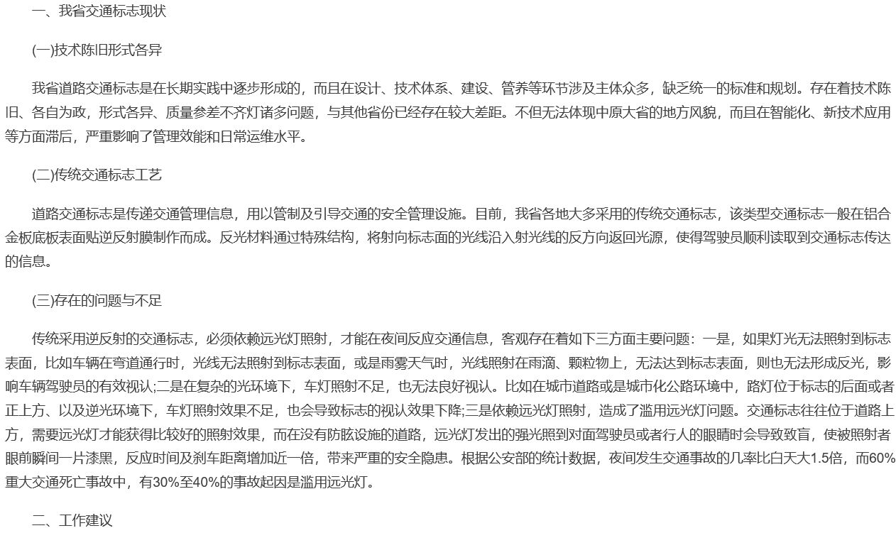 主動發光標志,因其具備獨特的功能優勢,主要有:(1)能主動發光,不需依賴汽車遠光燈照射;(2)提升標志的遠距離視認性;(3)增強標志的易捕捉性和警示性;(4)增強標志在雨、霧、冰、雪、霾、逆光等惡劣交通環境中,仍能保持良好的顯示效果。上述功能能彌補在特殊交通環境中普通逆反射標志的功能不足現象。為此,文中還給出相關建議:“一是在高速按需推廣主動發光交通標志替代傳統交通標志。可以充分借鑒先進省份的經驗,先行選擇高速公路出口、立交樞紐、隧道、視線不良的區域采用主動發光標志。在此基礎上,高速公路“視距提升”納入建設標準,并可結合高速公路新建、改擴建、大修等工程逐步升級改造;二是在公路重點路段更換主動發光交通標志。建議以省級財政資金補貼,地方財政資金配套的方式,逐步對夜間貨車通行集中、事故多發、易擁堵的國省道路段,國省道沿線勞務人員集中企業、貨運場站、施工工地等周邊路段,城鄉結合部、穿村過鎮路段的傳統交通標志牌進行升級,更換為主動發光交通標志,以保障交通安全,降低事故率;三是開展智能網聯應用,探索交通標志智慧化升級。將主動發光標志與智能網聯、數據融合等技術結合應用,既能發布道路、節點信息,也能發布行程時間、路況、事件等信息。并以此為載體開展智慧高速公路建設,增強了駕駛人與指路標志之間的信任度與互動性,大幅度優化通行秩序提升通行效率。”