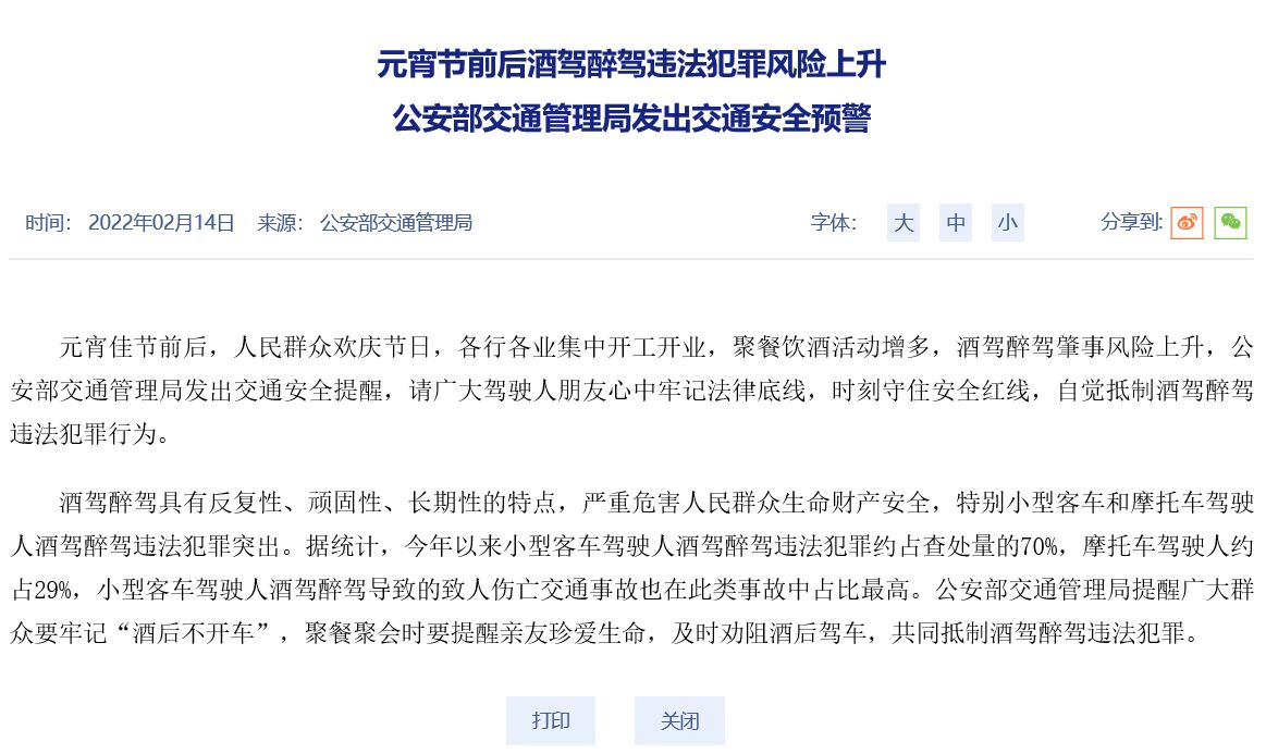 明天就是元宵節(jié),春節(jié)年假最長的企業(yè)單位、個(gè)體工商戶,也將陸續(xù)開工開業(yè),出現(xiàn)扎堆的聚餐團(tuán)聚活動(dòng),按以往經(jīng)驗(yàn),元宵節(jié)前后,酒駕醉駕等肇事風(fēng)險(xiǎn)明顯上升。為此,公安部交通管理局于2022年2月14日,特別發(fā)文《元宵節(jié)前后酒駕醉駕違法犯罪風(fēng)險(xiǎn)上升,公安部交通管理局發(fā)出交通安全預(yù)警》,旨在提醒廣大駕駛?cè)伺笥研闹欣斡浄傻拙€,時(shí)刻守住安全紅線,自覺抵制酒駕醉駕違法犯罪行為。