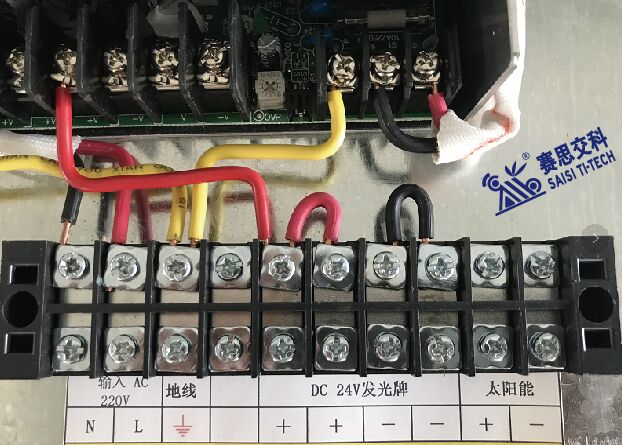 (4)控制線接電。本操作必須為持證的專業電工?。?/strong>標志牌背面出1根2芯電纜線,內部工作電壓為DC24V,注意區分電線的正負極(具體供貨隨附的《安裝說明書》會詳細列明),將這兩根線接入"DC發光標志牌"所示接線端子上,嚴謹接入旁邊的高壓區??!接線板如下圖所示。將“空開”按鍵下拉至“關閉”狀態 ,再將市電接線接入左側,輸入AC220V的接線端子,在開啟電源前,先檢查以下接線,確保準確無誤后,方可開啟電源。注:控制系統為自動光控(白天不亮,夜晚自動開啟),白天安裝時,需測試,可用黑色物蓋在控制箱的光敏端子上,模擬夜晚效果。