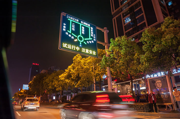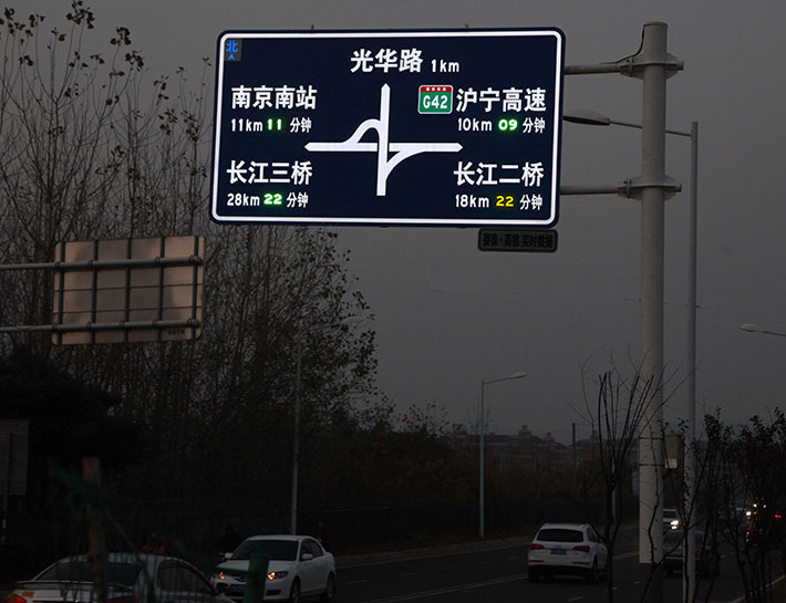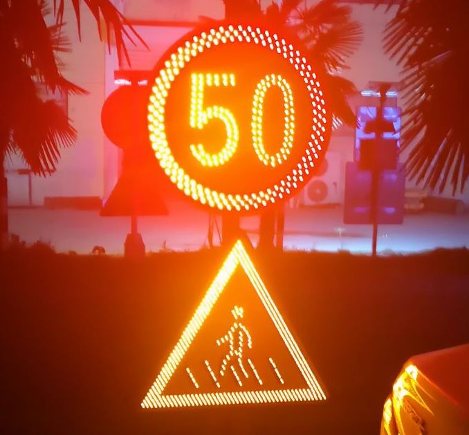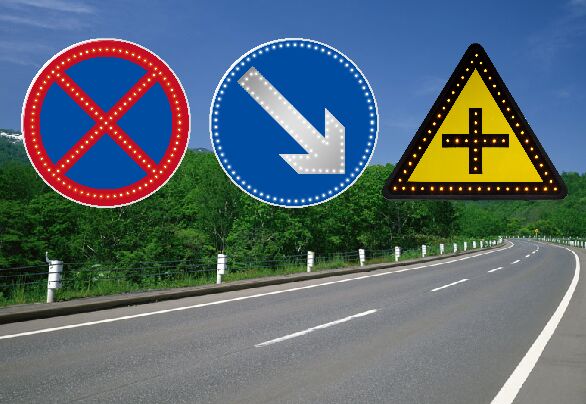 “外置LED點陣”工藝,所應用的LED發光管具備極強的光穿透性,特別是在陰雨、霧霾等道路能見度低的交通場景中,其優點在于表現關鍵圖案的警示效果,再應用頻閃的發光模式,根據遠距離警示效果,尤其適用于提示道路危險源的警示標志,和傳達管理指令的禁令標志等。但其不足之處在于:顯示文字、字符、小圖案等沒有“內置LED投射”工藝那么飽滿、平整。所以,為追求最佳視覺效果,通常會根據同一塊版面中的不同內容,選擇最佳的工藝表現方式,如:可變車道標志潮汐車道標志,我們會采用這樣的工藝方式處理,邊緣線采用的半投射工藝,箭頭采用“外置LED點陣”工藝。如:帶有輔標的禁令標志,禁令圖標部分采用“外置LED點陣”工藝,輔標部分采用“內置LED投射”的全投射工藝。